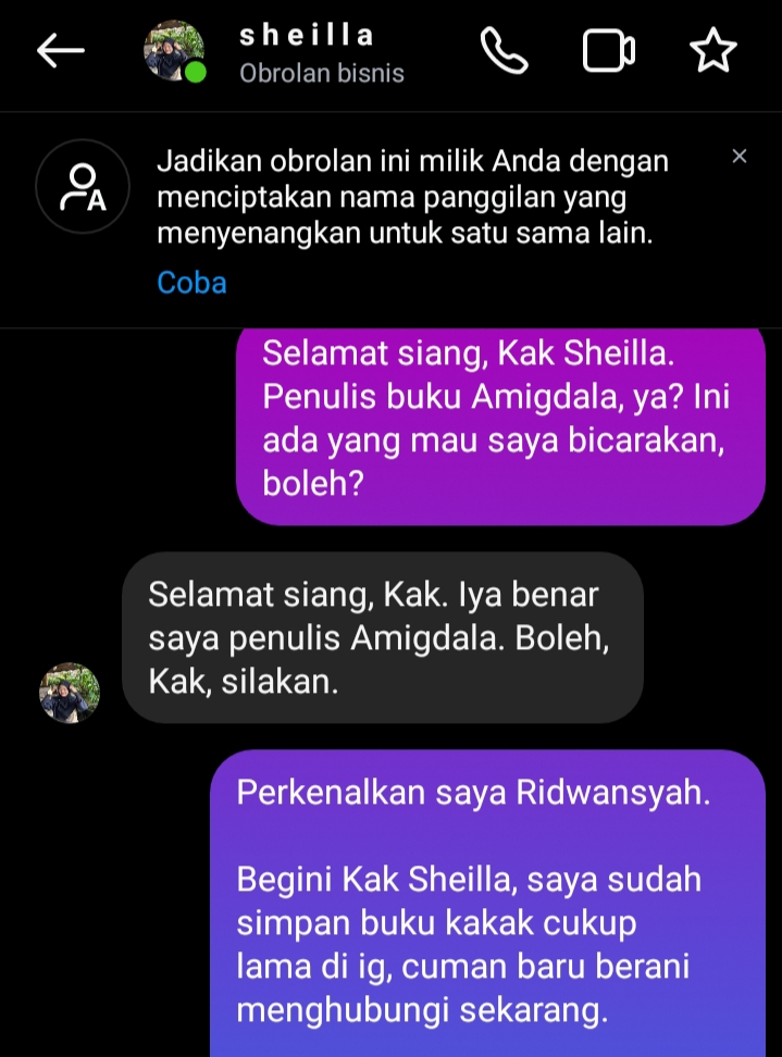 FYI, pertama kali kenalan dengan Sheilla, saat itu saya nge-DM via Instagram. Mengenalkan diri padanya dengan tujuan: menawarkan jasa review buku. Dan, di situ lah awal dari segalanya 😊