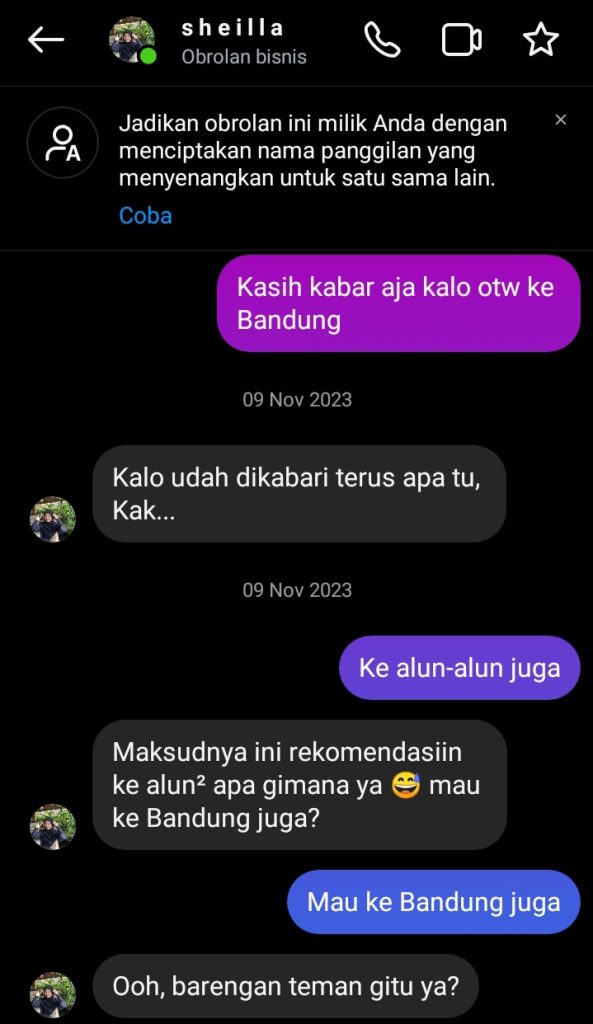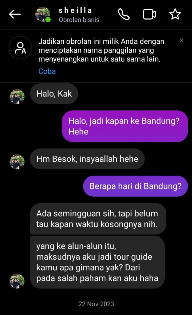 Hmmm…ternyata Sheilla berketurunan orang Sunda dari ibunya, dan saat itu dirinya mau ke Bandung untuk mendatangi wisudaan adiknya. Terbesitlah di benak saya; gimana kalau saya ajak ketemuan aja?  😊