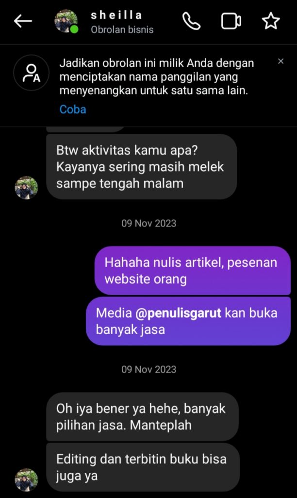 Usai bukunya diposting di blog dan Instagram Media Penulis Garut, beberapa hari kemudian, saya stalking lagi akun Instagramnya. Saya sebetulnya nggak pernah stalking ulang akun Instagram penulis yang sudah menggunakan jasa review buku, ya katakanlah setelah menggunakan jasa, yasudah lupakan, lalu tawarkan jasa lagi ke penulis baru.